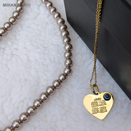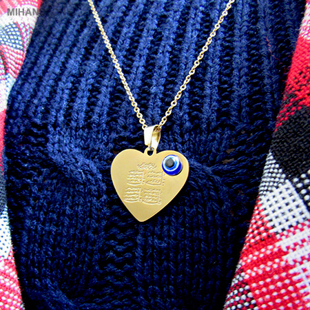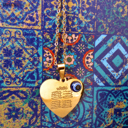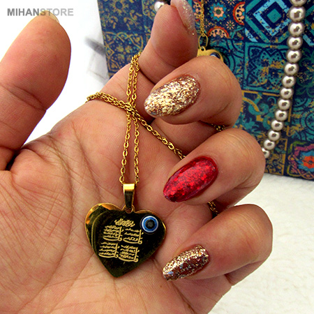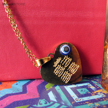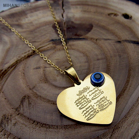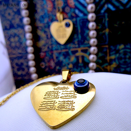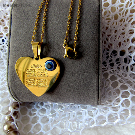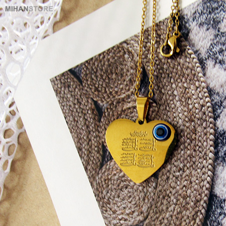 این گردنبند از استیل رنگ ثابت ساخته شده و دارای پلاک چهار قل و چشم نظر خاص و زیبا می باشد .استفاده از گردنبندهای قرآنی برای دوری از چشم زخم، سحر و آسیب به مال و جان توصیه شده است. این گردنبند با سوره های قرآنی، حس آرامش خوبی را به شما منتقل کرده و مناسب استفاده کودک تا بزرگسال است. گردنبند طرح قلب با چهار قل و چشم نظر که از جنس استیل طلایی رنگ ثابت و ضد حساسیت می باشد و هیچ گونه حساسیتی برای پوست ایجاد نمی کند و با خیال آسوده از این گردنبند استفاده نمایید. این گردنبند یک زنجیر از مدل دیپلمات ساده طلایی با طول شصت سانتیمتر دارد که با قفل مدل قلاب محکم بسته می شود. این گردنبند می تواند مناسب آقایون ، بانوان و همچنین مناسب کودکان باشد.