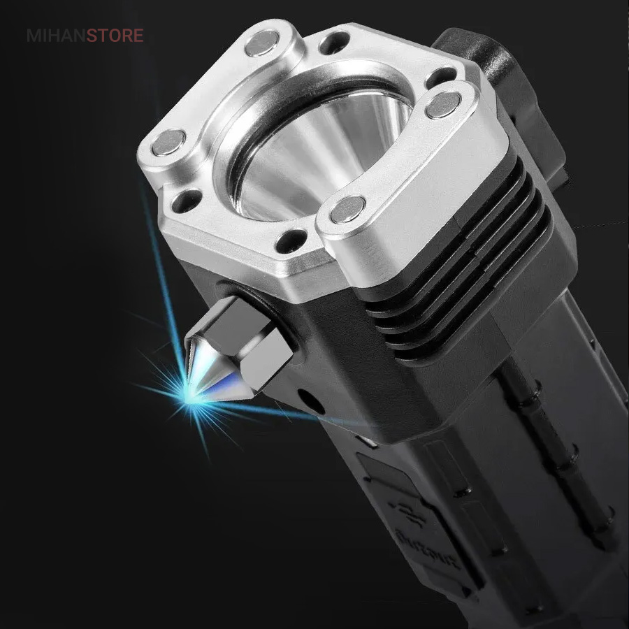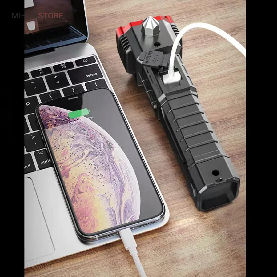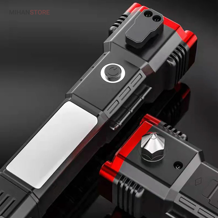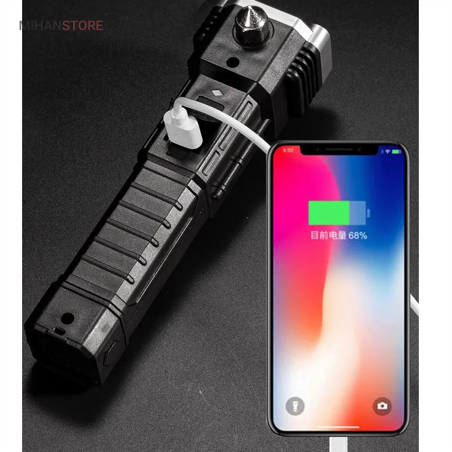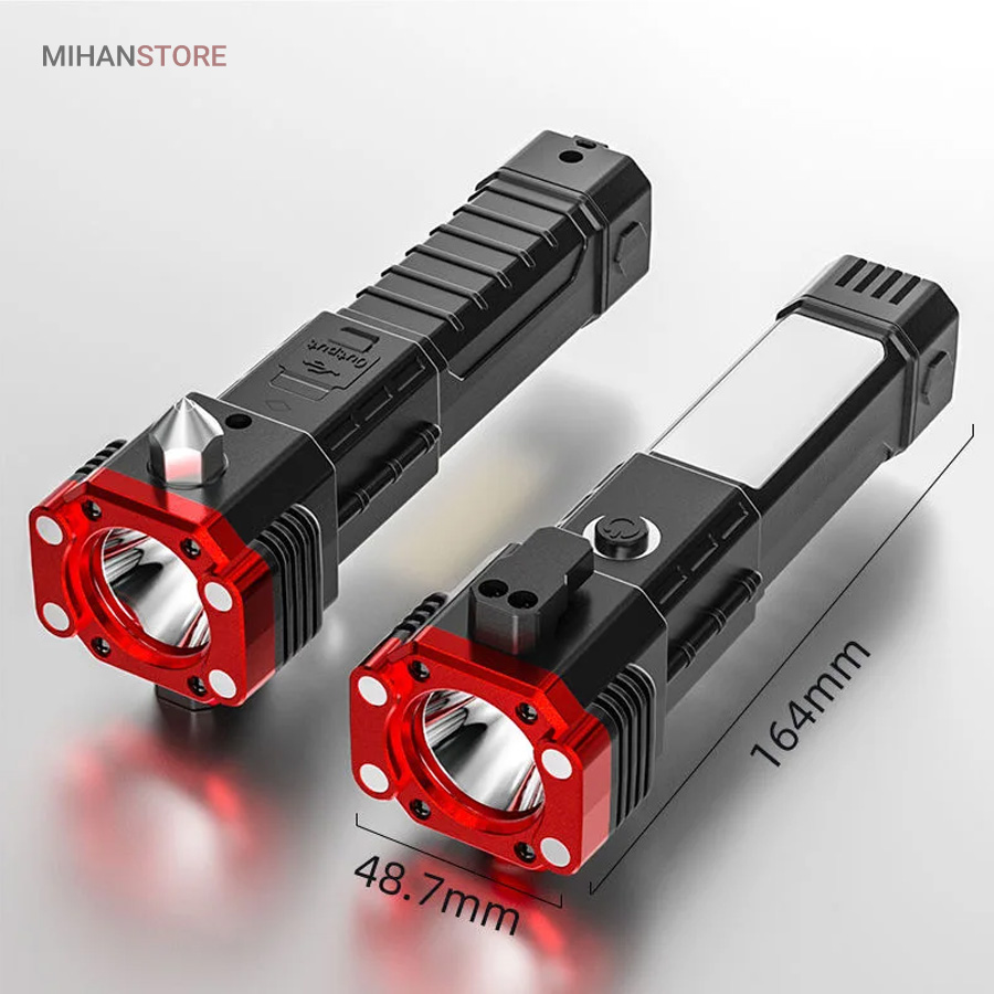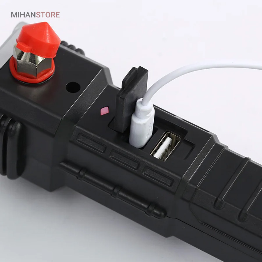 چراغ قوه دستی 8 کاره مدل led torch با قابلیت انجام کارهای فراوان از جمله 3 حالت نور- دارای چکش اتش نشانی-دارای تیغ مخفی برای بریدن کش و طناب.دارای مگنت اهن ربا برای چسبیدن به اهن و تعمیر خودرو- قابلیت استفاده بعنوان پاور بانک در مواقع اضطراری-قابلیت شارژ شدن توسط شارژر موبایل میباشد. این چراغ قوه پر کاربرد وسیله ای عالی برای مسافرت و کمپینگ و نگهداری در خودرو است و داشتن ان میتواند بسیار به شما کمک کند.