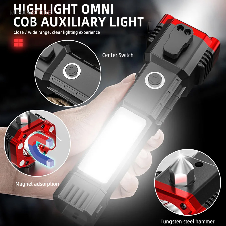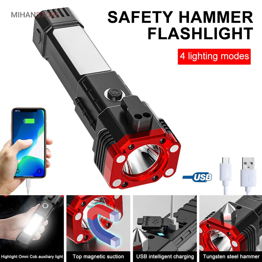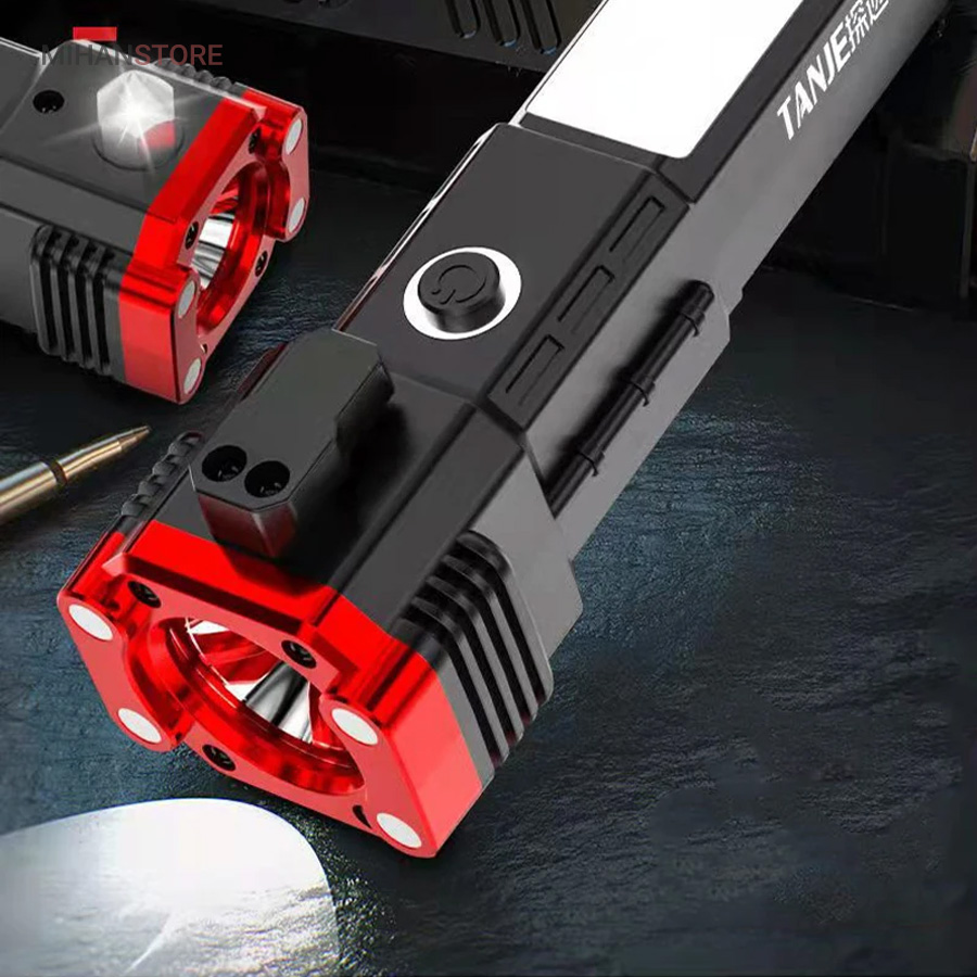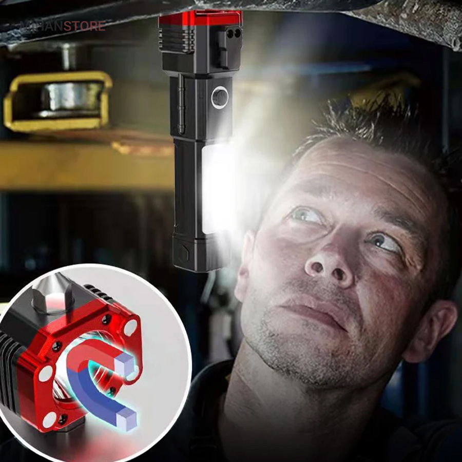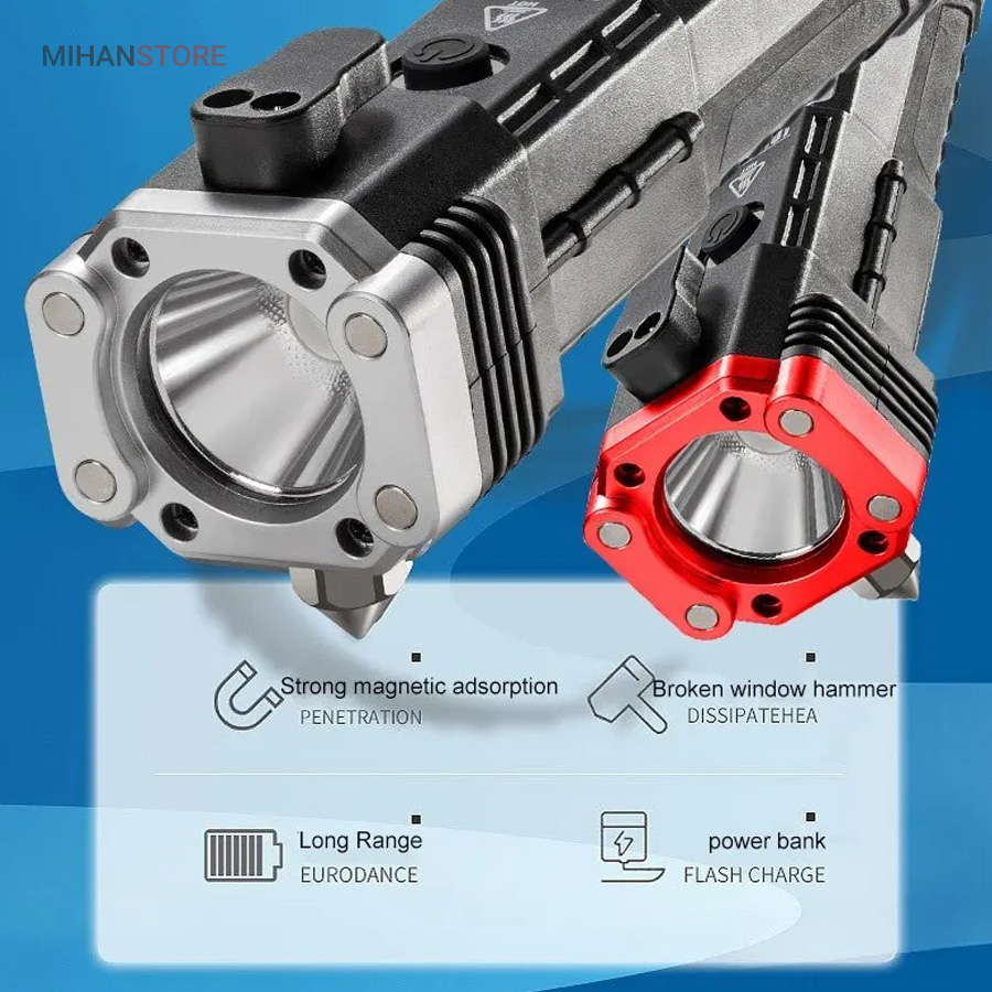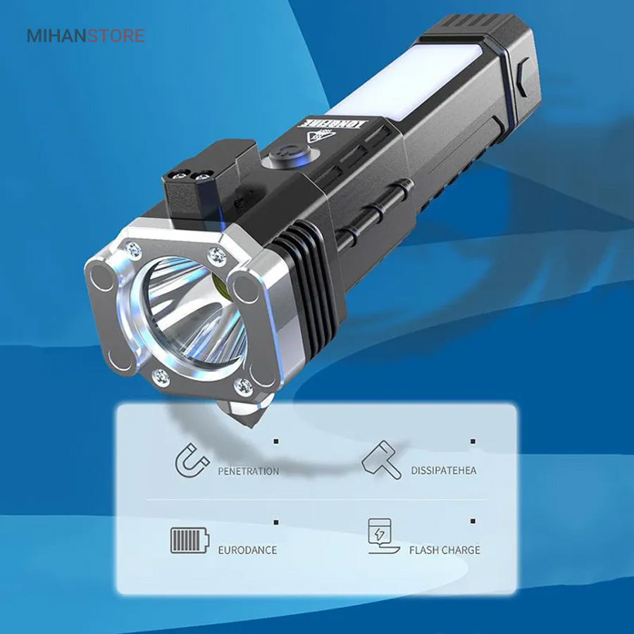چراغ قوه دستی 8 کاره مدل led torch با قابلیت انجام کارهای فراوان از جمله 3 حالت نور- دارای چکش اتش نشانی-دارای تیغ مخفی برای بریدن کش و طناب.دارای مگنت اهن ربا برای چسبیدن به اهن و تعمیر خودرو- قابلیت استفاده بعنوان پاور بانک در مواقع اضطراری-قابلیت شارژ شدن توسط شارژر موبایل میباشد. این چراغ قوه پر کاربرد وسیله ای عالی برای مسافرت و کمپینگ و نگهداری در خودرو است و داشتن ان میتواند بسیار به شما کمک کند.