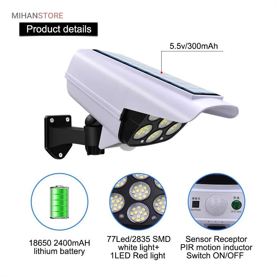 پروژکتور های خورشیدی طرح دوربین مدار بسته پروژکتور هایی هستند که حالت سیکوریتی دارند و حدودا بین 180 تا 200 وات نور تولید می کنند و شامل دو باتری لیتیومی 3.7 ولتی و پنل 3 واتی بزرگ هستند. دوربین های به کار رفته در این پروژکتور ها 2 باتری هستند و کیفیت بالاتری دارند در صورتی که دوربین های موجود در بازار به صورت تک باتری نیز وجود دارد. توانایی تابش 360 درجه دارند و پایه دارند. این نوع پروژکتور ها حتما باید زیر آفتاب باشند ولی در سایه نیز می توانند کار کنند اما نوری که ایجاد می کنند کمتر است و بازدهی کمتری دارند در این صورت باتری زودتر خراب می شود. بهتر است از این نوع پروژکتور ها در مکان های پر تردد استفاده شود. نور بسیار خوبی دارند و ارتفاع نصب آن ها بهتر است که بیش از 3 متر نباشد چرا که اگر سنسور PRD در ارتفاع بیش از 3 متر قرار گیرد حساسیت خود را از دست می دهد و قابلیتی که باید داشته باشد را ندارد. از روی پنل در این پروژکتور ها می توان متوجه خاموش یا روشن بودن آن شد به این صورت که مدار هایی درون آن وجود دارد که با تغییر ولتاژ از پنل و صفر شدن پنل، شب شدن یا تاریک شدن تشخیص داده می شود یعنی سنسور پتانسیلی دارند و همچنین دارای ریموت هستند. این نوع از پروژکتور ها را می توان زمان بندی کرد. این پروژکتور ها از پر فروش ترین جنس ها هستند.این یک لامپ دیواری خورشیدی با طراحی ظاهری دوربین مداربسته شبیه سازی است که می تواند در مکان های مختلف مانند دروازه ، راهرو ، حیاط و غیره نصب شود.