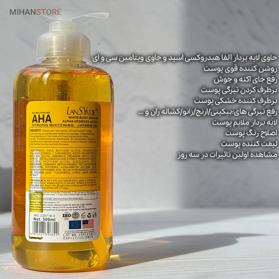 سرم روشن کننده تخصصی بدن حاوی AHA و ویتامین سی محصول تخصصی برای مراقبت از پوست است. سرم روشن کننده بدن aha با ترکیبات موثری همچون آلفا هیدروکسی اسید (AHA)، ویتامین C و ویتامین E طراحی شده است که به لایه‌برداری پوست، روشن‌کنندگی و کاهش تیرگی‌ موضعی کمک می‌کند. سرم روشن کننده aha علاوه بر حذف سلول‌های مرده و جای آکنه، باعث رفع خشکی و افزایش لطافت پوست می‌شود. استفاده از این محصول به‌ویژه برای رفع تیرگی در نواحی حساس بدن مانند صورت، کشاله ران، زانو و آرنج توصیه می‌شود. در واقع، سرم روشن کننده بدن aha با حجم بالا و فرمولاسیون حرفه‌ای گزینه‌ای مقرون‌به‌صرفه برای افرادی است که به دنبال شفافیت و شادابی پوست خود هستند.