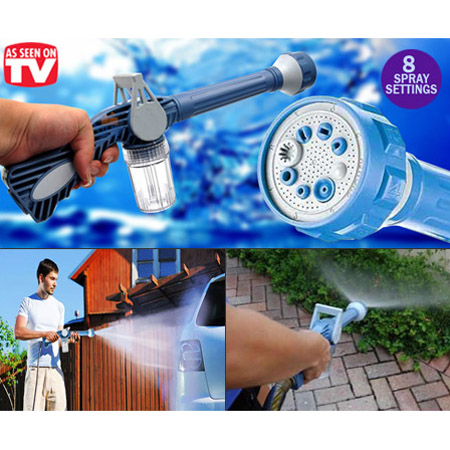 ایزی جت وسیله ای کامل و بی نظیر برای انجام کلیه امور آبیاری باغچه ها، باغبانی، تمیزکردن سطوح خارجی و نمای ساختمانها و همه فضاهای خارجی منزل و همچنین شستشو اتومبیل می باشد. با استفاده از ایزی جت انرژی آب را مهار کرده و می توانید هر طور که مایل هستید با استفاده از 8 خروجی مختلف تعبیه شده روی نازل انتهایی، آب را با سرعت و شدت دلخواه خود بر روی سطوح مختلف اسپری نمایید. با این وسیله،‌ آب با فشار زیاد، می تواند در فواصل دور و یا ارتفاعات غیر قابل دسترس متمرکز شده و براحتی و بدون نیاز به جارو و طی، کلیه سطوح را به سرعت تمیز نماید. از ویژگی های دیگر این محصول مخزن نگه دارنده مواد شوینده آن می باشد که پاکیزگی کامل اتومبیل و یا منزل شما را به ارمغان خواهد آورد.