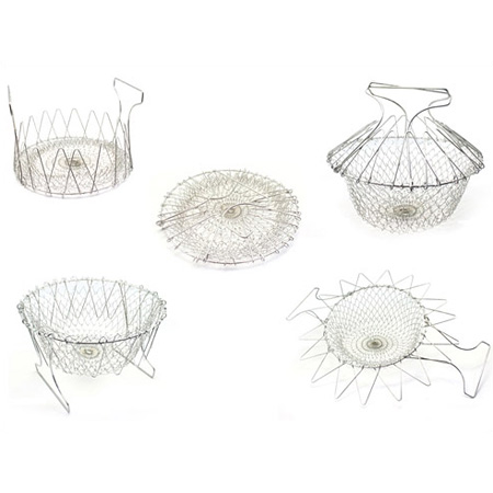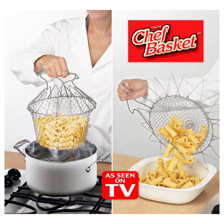 سبد آشپزخانه چف بسکت Chef Basket یک محصول فوق العاده برای سرخ کردن، پختن، بخار پز کردن و در عین حال با بدنه استیل سبک مناسب برای هر پخت و پزی می باشد. چف بسکت طوری طراحی شده که به راحتی جمع می شود و دارای دستگیره مخصوص می باشد که به هیچ وجه داغ نمی شود. با چف بسکت به راحتی می توانید آشپزی کرده و روغن اضافی مواد سرخ شده را گرفته و حتی سبزیجات را بخارپز کنید. با سبد چند کاره چف بسکت علاوه بر سرخ کردن مواد غذایی گوناگون به راحتی می توانید بسیاری از مواد غذایی را بخار پز کنید. و از همه مهم تر دیگر غذای شما در اثر چسبیدن به کف قابلمه نمی سوزد چون چف بسکت با کف قابلمه هیچ برخوردی ندارد و باعث از بین رفتن کف قابلمه نمی شود.