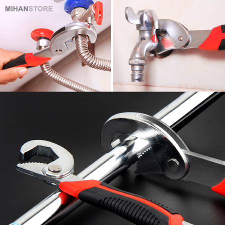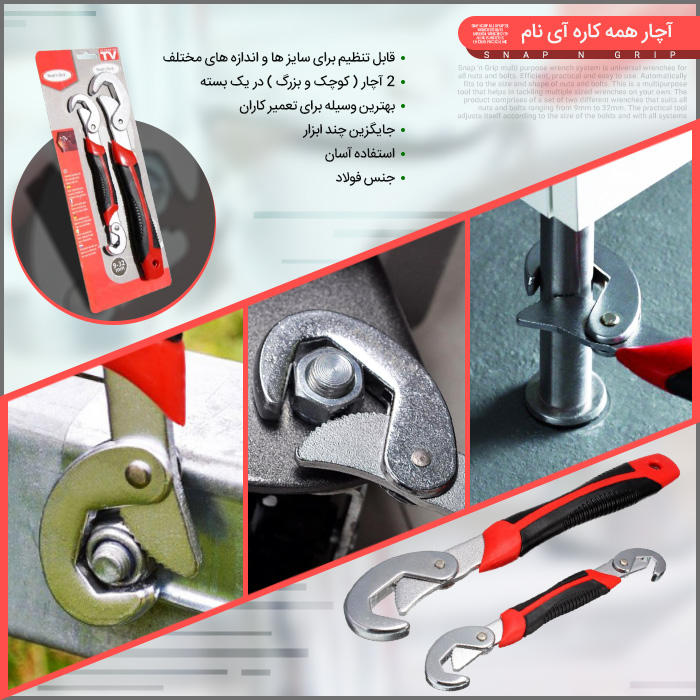 با این آچار می توانید هر چیزی که می خواهید را به راحتی هر چه تمام تر باز کنید. از شیر آب و شوفاژ گرفته تا مهره های خیلی ریز. با آچار همه کاره آی نام، دیگر شما نیاز به حمل و نگهداری آچار های دیگر ندارید. استفاده و حمل آچار Snap n Grip فوق العاده لذت بخش و آسان است. ویژگی مهم آچار آی نام طراحی خاص دهانه آن می باشد که هنگام باز کردن یا بستن مهره و یا جایی که می خواهید از آن استفاده کنید قفل می شود و این امر باعث شده شما به راحتی هر چه تمام تر کارتان را انجام می دهید. آچار همه کاره آی نام (Snap n Grip) وسیله ای بسیار ضروری برای هر خانه ای می باشد.