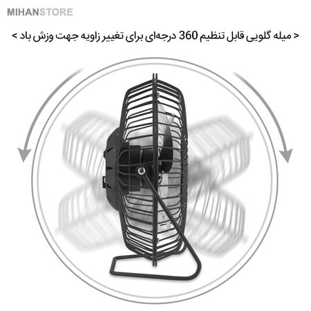 - میله گلویی قابل تنظیم ۳۶۰ درجه‌ای برای تغییر زاویه جهت وزش باد